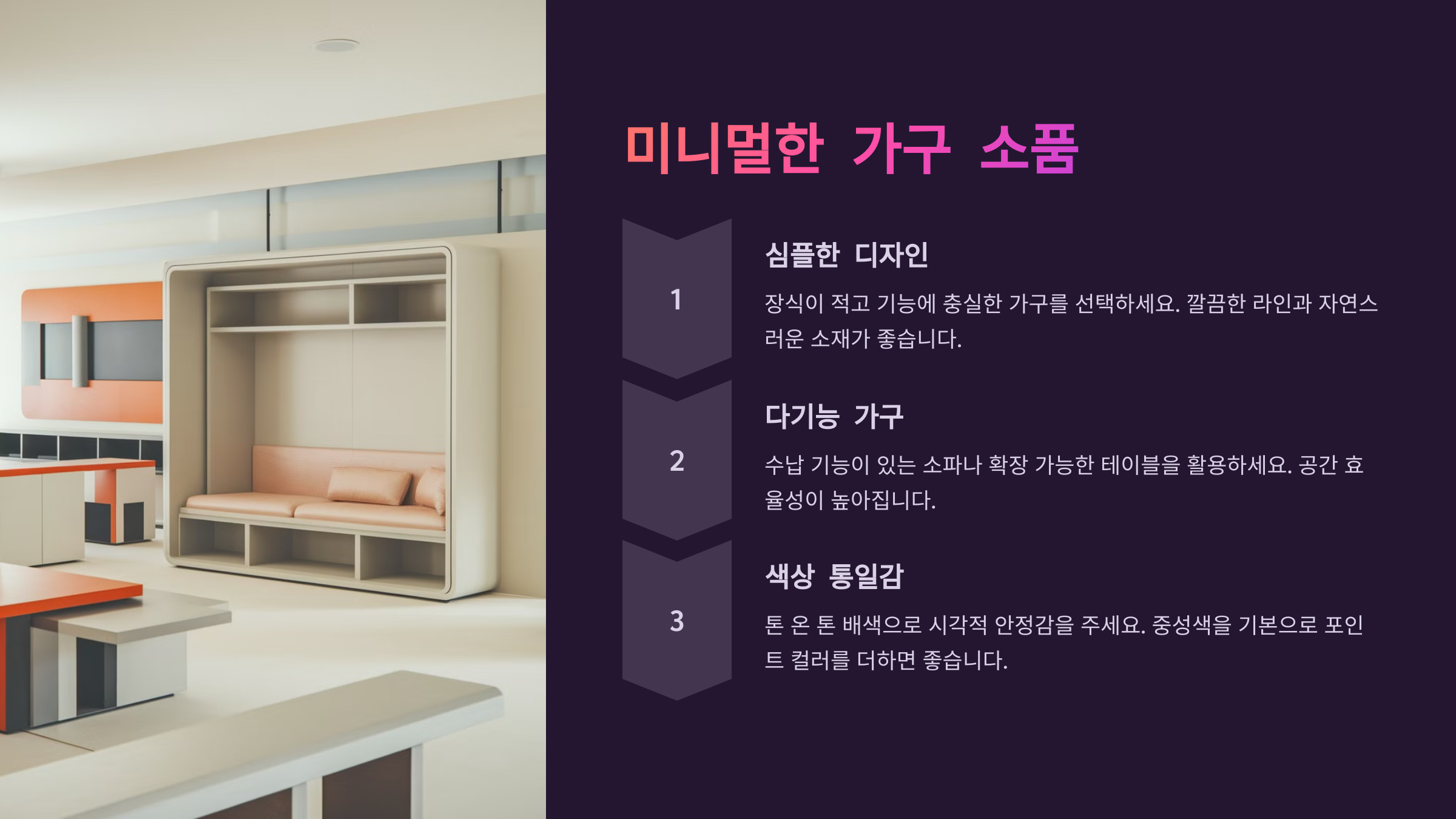 작은 공간에서도 실용성을 극대화할 수 있는 미니멀한 가구가 인기예요. 디자인이 심플하면서도 다용도로 활용할 수 있는 가구를 선택하면 공간이 깔끔해져요.