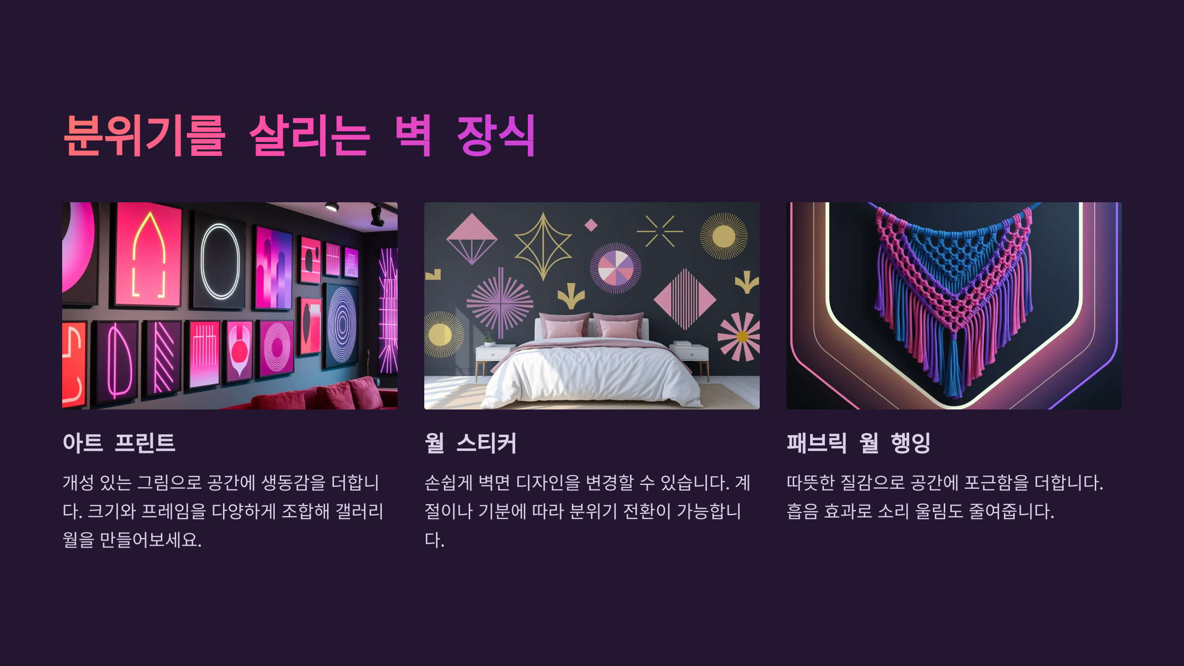 | 벽 장식 아이템 | 특징 | 추천 장소 |