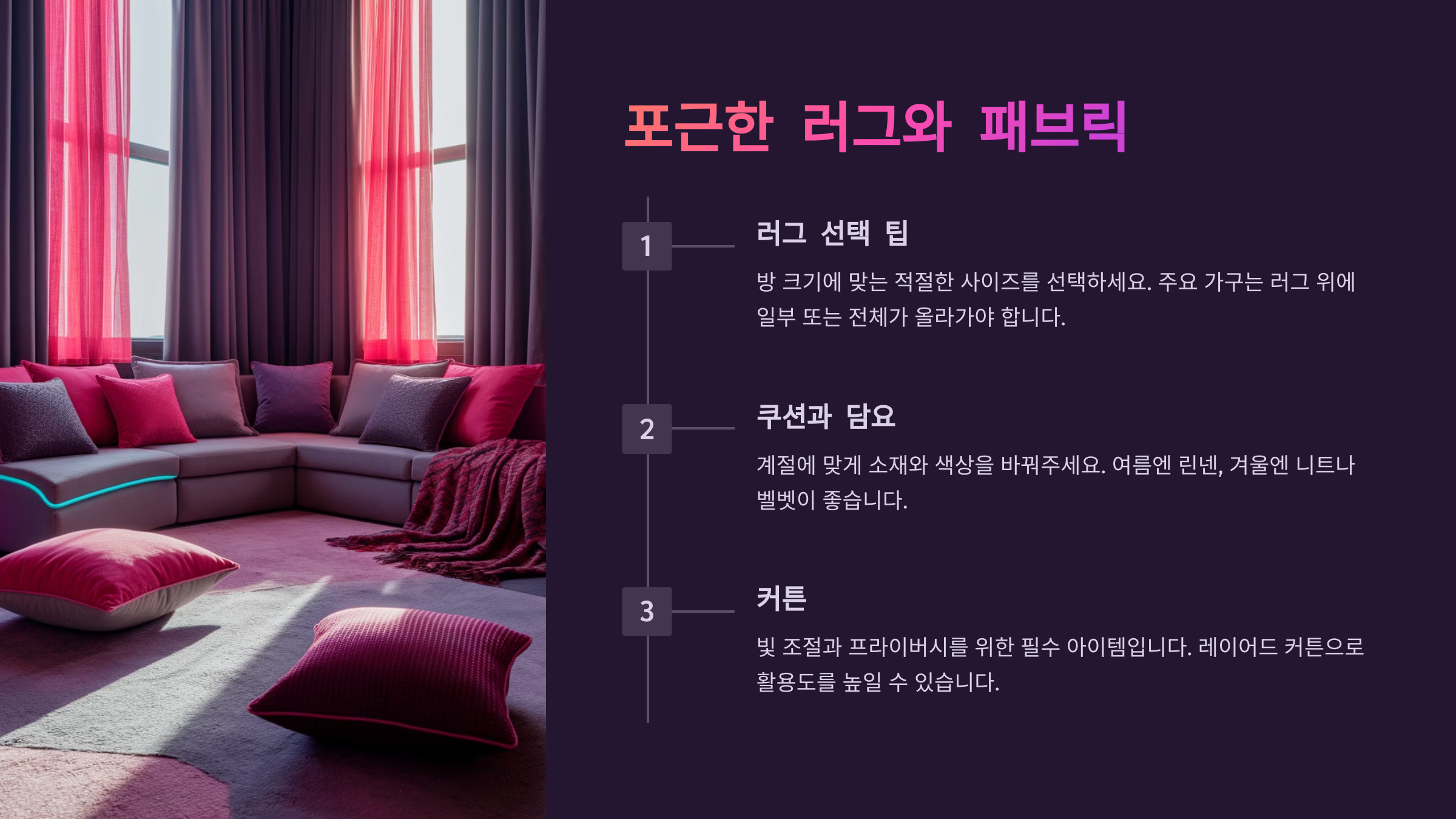 | 포근한 러그 | 보온성과 디자인 효과 | 침대 옆, 거실 공간 |