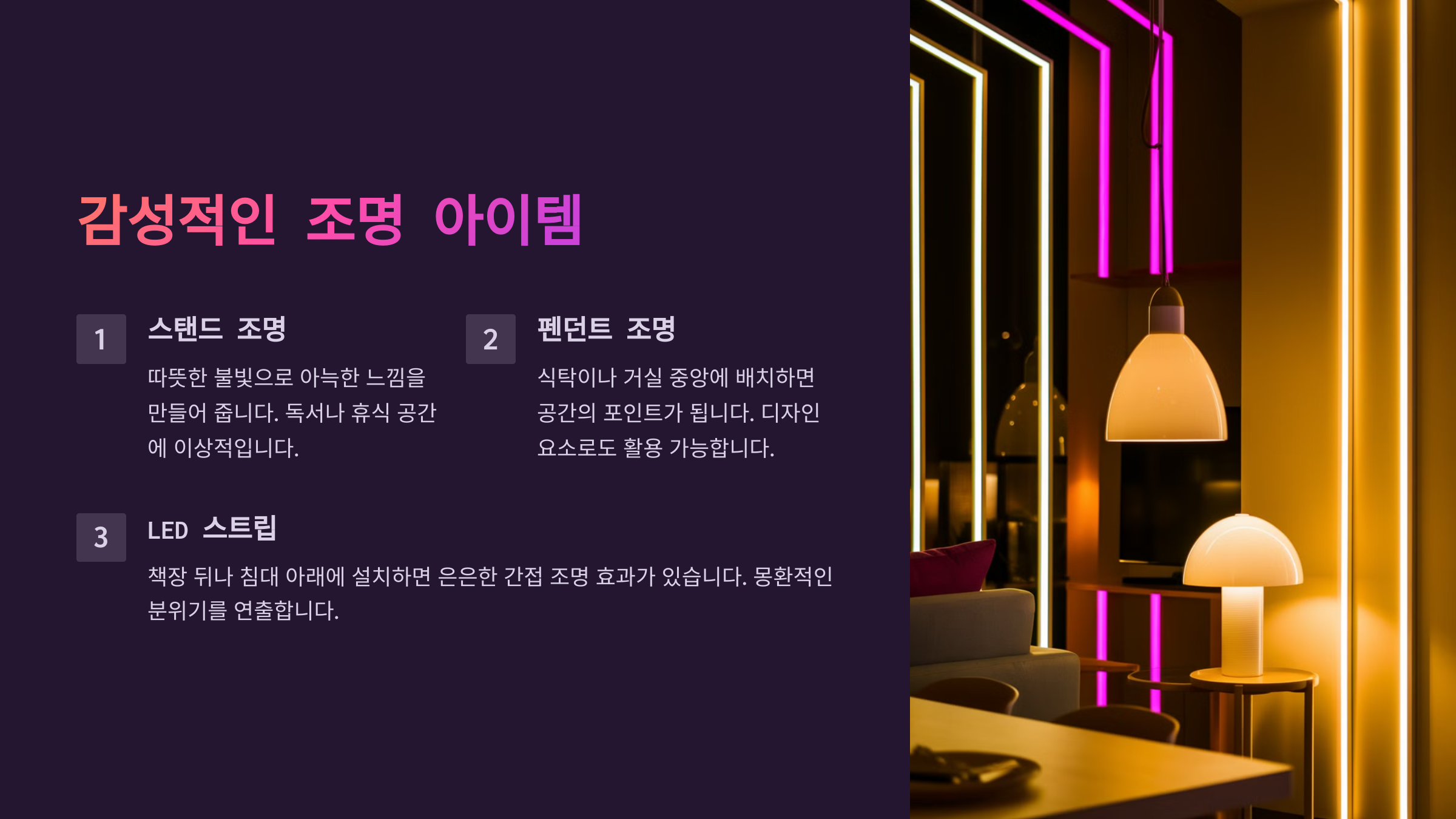 A5. 천장 조명보다는 무드등, 스탠드 등을 활용하면 더욱 따뜻하고 감성적인 분위기를 연출할 수 있어요.