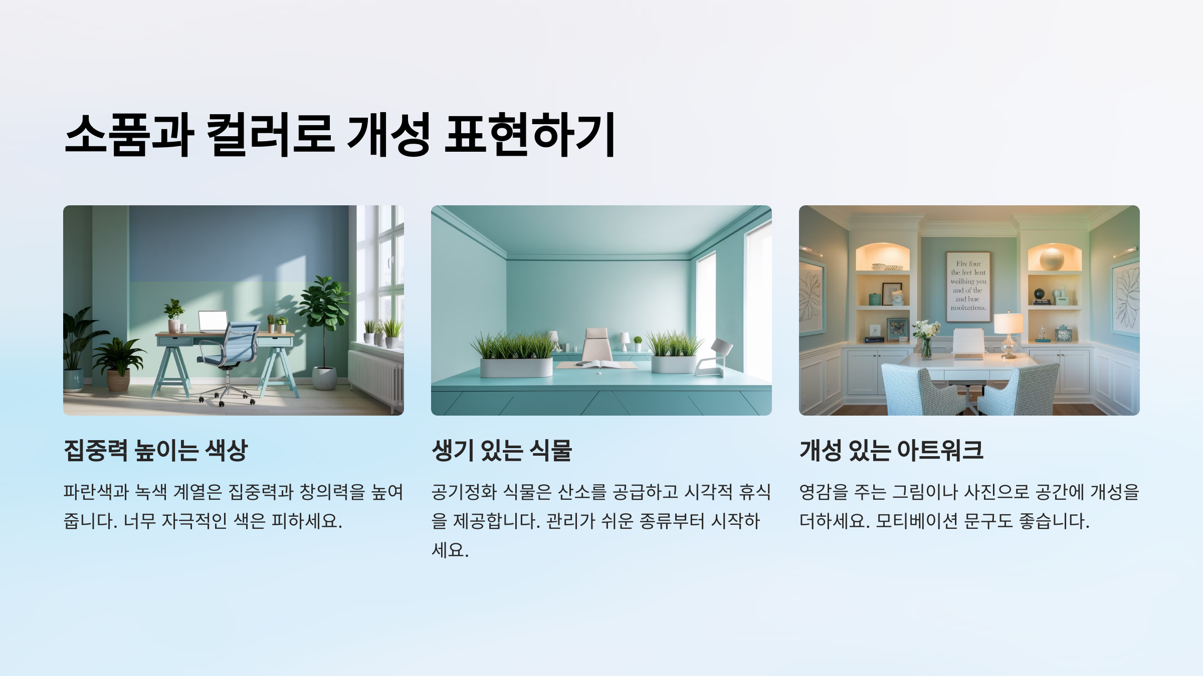 ✔ 컬러 선택: 색상은 공간의 분위기를 결정하는 중요한 요소예요. 화이트나 베이지 계열은 차분한 느낌을 주고, 블루나 그린 계열은 집중력을 높이는 효과가 있어요.